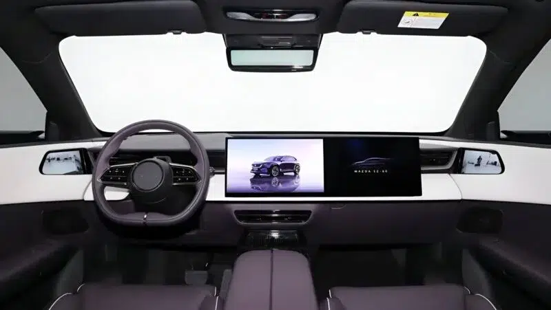 Mazda EZ-60 kabin tasarımı, teknolojik detaylarıyla öne çıkıyor. En dikkat çeken öğe, 26,45 inçlik ultra geniş 5K çözünürlüklü ekran. Bu ekran; dijital gösterge paneli, medya oynatıcı ve klima kontrol sistemlerini bir arada sunuyor. Geleneksel fiziksel düğmelere yer verilmemesi, tüm işlemlerin dokunmatik ekran veya sesli komutlar üzerinden gerçekleştirilmesini sağlıyor.